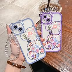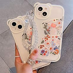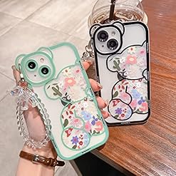 IAIYOXI for iPhone Case with Cute Flowers Bear Pattern, Camera Protector, Clear Phone Case and Lovely Strap Bracelet Chain, Compatible for iPhone for Girls Women