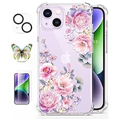 ROSEPARROT [4-in-1 Designed for iPhone 14 Case with Tempered Glass Screen Protector + Camera Lens Protector, Clear with Floral Pattern Design, Shockproof Protective Cover