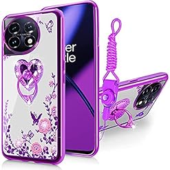 B-wishy for OnePlus 11 5G Phone Case Glitter Crystal Butterfly Heart Floral Slim TPU Luxury Bling Cute Protective Cover with Kickstand+Strap Case for OnePlus 11