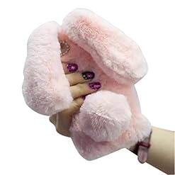 for iPhone SE 2016/5 5S Rabbit Fur Case (Not for SE 2020), Shinetop Bling Diamond Luxury Cute Soft Warm Fluffy Rabbit Fur Case Winter Handmade Bunny Plush with Crystal Bowknot Protective Cover-Pink