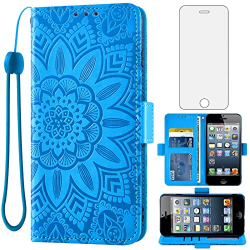 Asuwish Compatible with i5 Wallet Case and Tempered Glass Screen Protector Leather TPU Flower Folio Flip Credit Card Holder Stand Cell Accessories Phone Cover for iPhone 5 SLH