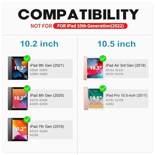 【Compatibility】This keyboard case is compatible with iPad 9th Generation 10.2-inch 2021(A2602/A2603/A2604/A2605); iPad 8th Generation 10.2-inch 2020(A2270/A2428/A2429/A2430); iPad 7th Generation 10.2-inch 2019(A2197/A2200/A2198); iPad Air 3rd Generation 10.5-inch 2019(A2152/A2123/A2153/A2154), iPad Pro 10.5-inch 2017(A1701/A1709/A1852).