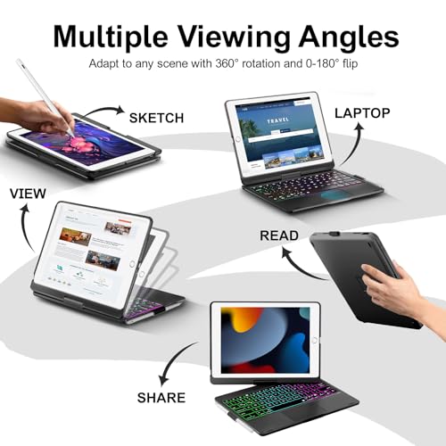 【Multiple Viewing Angles】iPad keyboard 9th generation supports 360° rotation and 0-180° flip, effortlessly adjusting to the most comfortable viewing angle. Whether you’re a professional, a writer, or frequent traveler, our keyboard for iPad 9th generation is designed to meet your needs