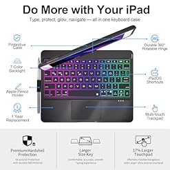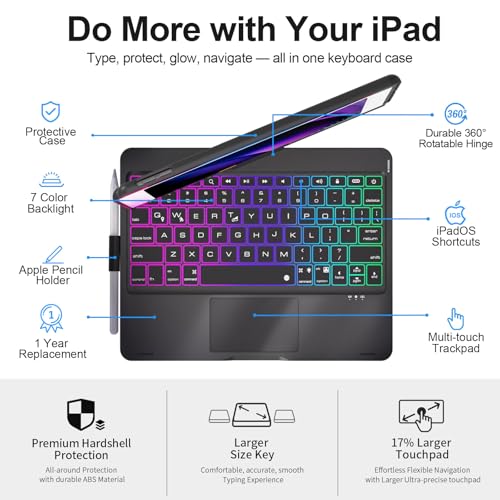 【Rainbow Backlit】Illuminate your workflow with vibrant rainbow backlight, iPad 8th generation case with keyboard features 3 adjustable brightness levels. You can customize brightness and backlight color to suit your preferences and habits. Enjoy a sleek and stylish setup with Baisla iPad 9th generation keyboard case with pencil holder