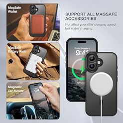 ♛【Compatible with MagSafe Accessories】This iPhone 16 Phone Case, with a built-in magnetic ring that aligns perfectly with MagSafe chargers and other Qi-certified chargers, offers a strong attach experience and faster wireless charging. This iPhone 16 Case magnetism is super strong, it can be firmly connected with all magnetic accessories such as Magnetice chargers, wallets, battery packs, car mounts, etc. Using chargers and other Qi wireless chargers and will not affect the signal.