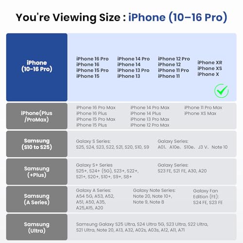 | Size | iPhone (10 to 16 Pro), iPhone (Plus-Pro Max), Samsung (A Series), Samsung (plusPlus), Samsung (S10 to S25), Samsung (Ultra) |