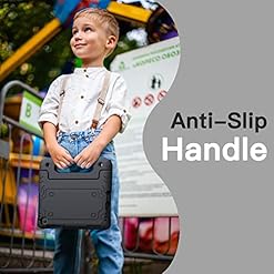 [Versatile Stand] Designed with a kid-friendly handle with anti-slip texture. It is easy for kids to carry around and fold it back to convert into a sturdy stand for hands-free viewing and comfortable typing
