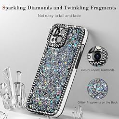 SPARKLY AND GLITTER DESIGN: This eye-catching phone case features a dazzling, luxurious diamond design on the lens and edges, with diamonds that are securely set. The back is processed with glitter drop glue, avoiding the issues of glitter paper reviews and pattern fading, and making your phone look more beautiful and charming.