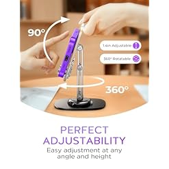 360° Rotation And Height and Angle Adjustable: Triple-hinge design makes this phone holder for desk significantly taller than ALL others double-hinge design, with easy height adjustments from 4.6 inches and angle adjustments between 5°-85°. This ergonomic design ensures a more comfortable viewing angle and height, helping to strengthen posture and reduce neck and back strain. Additionally, desk phone stand features a 360° rotation for easy screen sharing, and the rotation produces a pleasant clicking sound