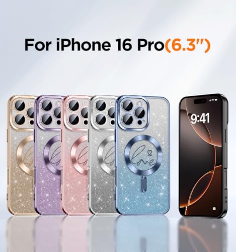 Misscase for iPhone Case Magnetic Glitter with Full Camera Lens Protector,[Compatible with MagSafe] Cute Glitter Bling Sparkly Love Hearts Plating Cover Phone Case for Women Girls