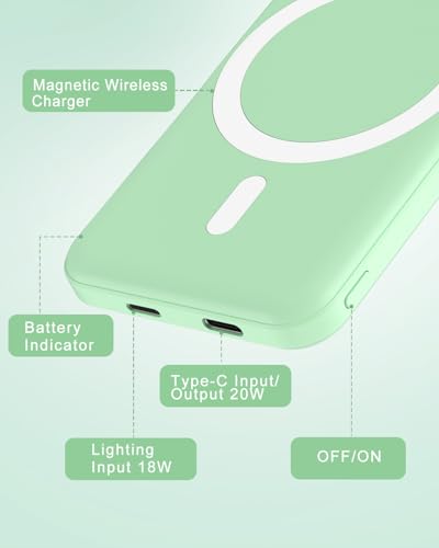 Fast Wireless & Wired Charging: Support 5W, 7.5W, 10W and 15W Max wireless charging and max 20W USB-C output; support max 12W Lighting input and max 18w USB-C input; The wireless charger can charge 2 Devices at the same time, shared charging with no waiting. And the portable charger iPhone uses soft silicone material to protect your phone from damage while wireless charging; The magnetic portable charger for iphone ensures faster charging speeds
