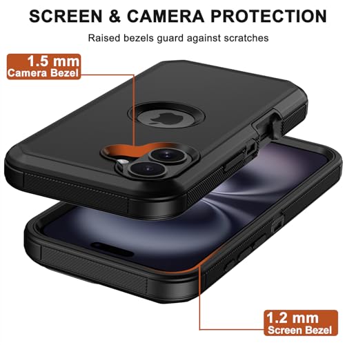 RubCase for iPhone 16 Phone Case, Military Grade Drop Protection Cell Phone Cover with Belt Clip Holster Stand, Screen Protector x2 Rugged Shockproof Kickstand for iPhone 16 Case 6.1 inch