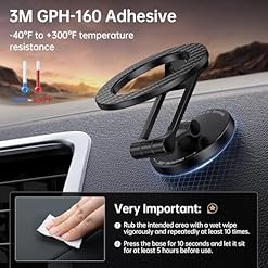 【Genuine 3M Adhesive】- It uses authentic 3M GPH-160 adhesive for enhanced stability. Even in extreme temperatures ranging from -40°F to +300°F, the magnetic car mount maintains adhesion, offering long-lasting stability, and includes spare adhesive pads for replacement. Press for 10 seconds and wait for 5 hours to strengthen adhesion. (IMPORTANT NOTICE: 3M adhesive tape is not suitable for application on interior surfaces like genuine leather, suede, and oil-coated fabrics. Avoid using it on these surfaces to prevent damage or poor adhesion.)