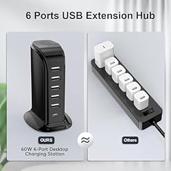 6 in 1 USB charger block with c port: Support 6 devices simultaneously, quick charger up to 2.4A for single USB port.